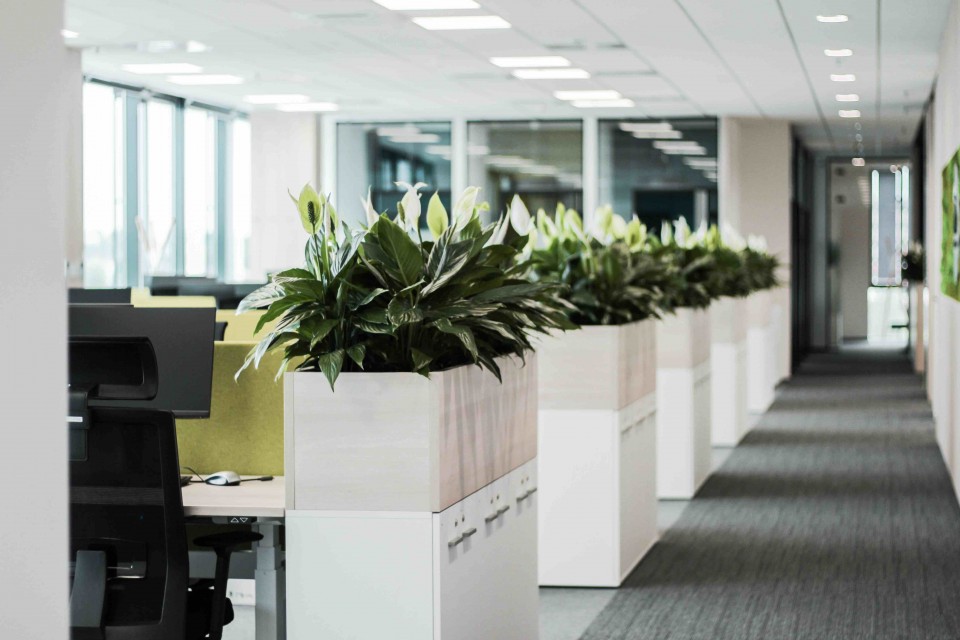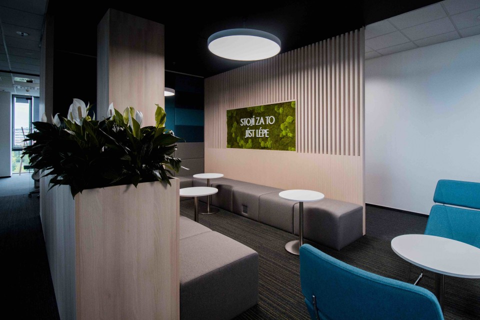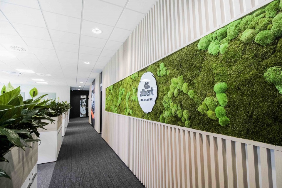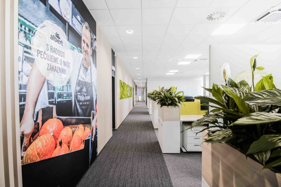 Návrh designu, výroba a dodání mechových stěn, dodání rostlin včetně výroby plastových vložek do nábytku na míru, dodání květináčů a hydroponických rostlin do centrály spol. AHOLD.