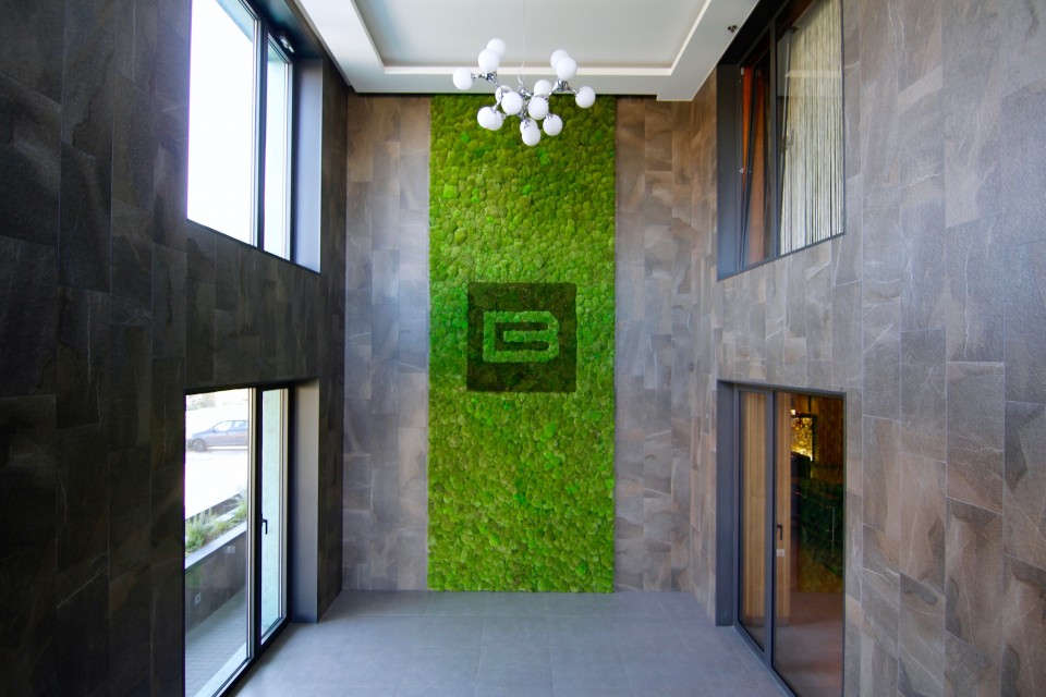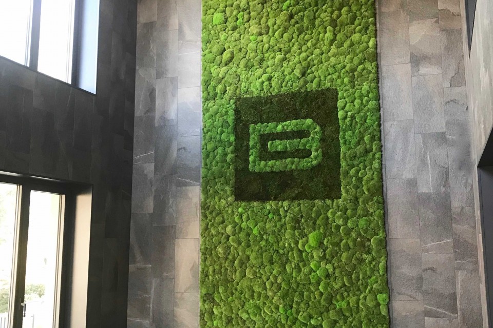 Výroba a dodání stěny z konzervovaného mechu s ručně skládaným logem.