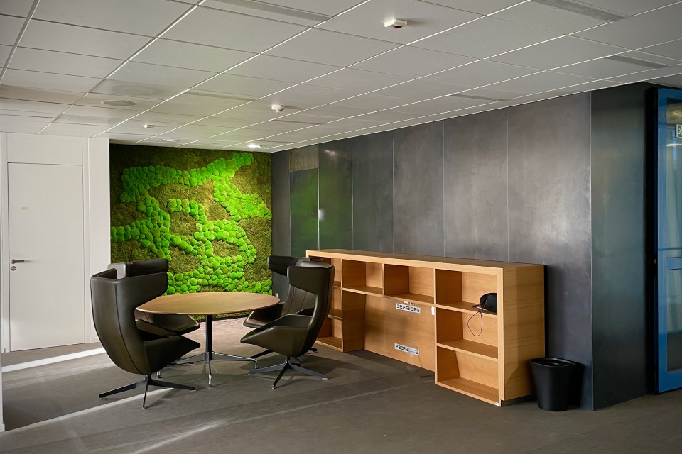 Návrh designu, výroba a dodání mechových stěn s konzervovanými rostlinami a dřevinami.