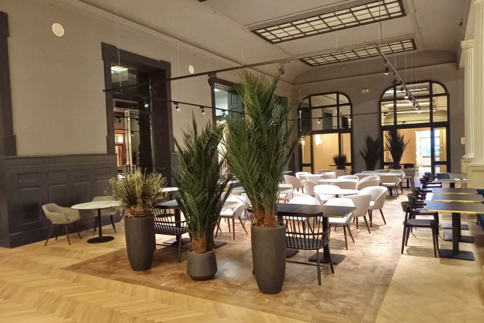 Konzervované palmy Phoenix 550cm, 400cm a 200cm. Konzervované palmy Washingtonia 240cm. Živé rostliny Ficus Lyrata, Areca Lutescence a Philodendron Minima. Kolekce květináčů Raindrop, Fiberstone a Nathan z našeho katalogu designových květináčů https://www.flower-company.cz/userfiles/53361-baq-brochure-2020_flowercompany_web_small.pdf